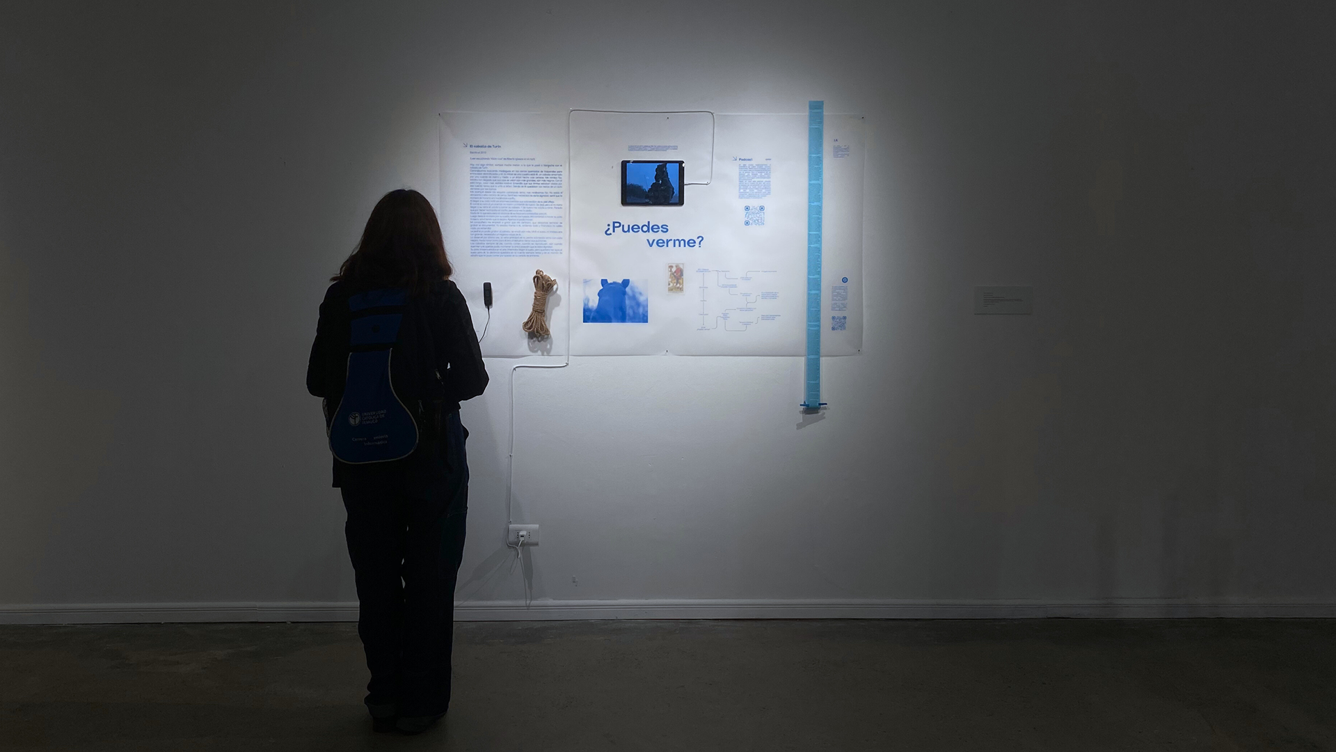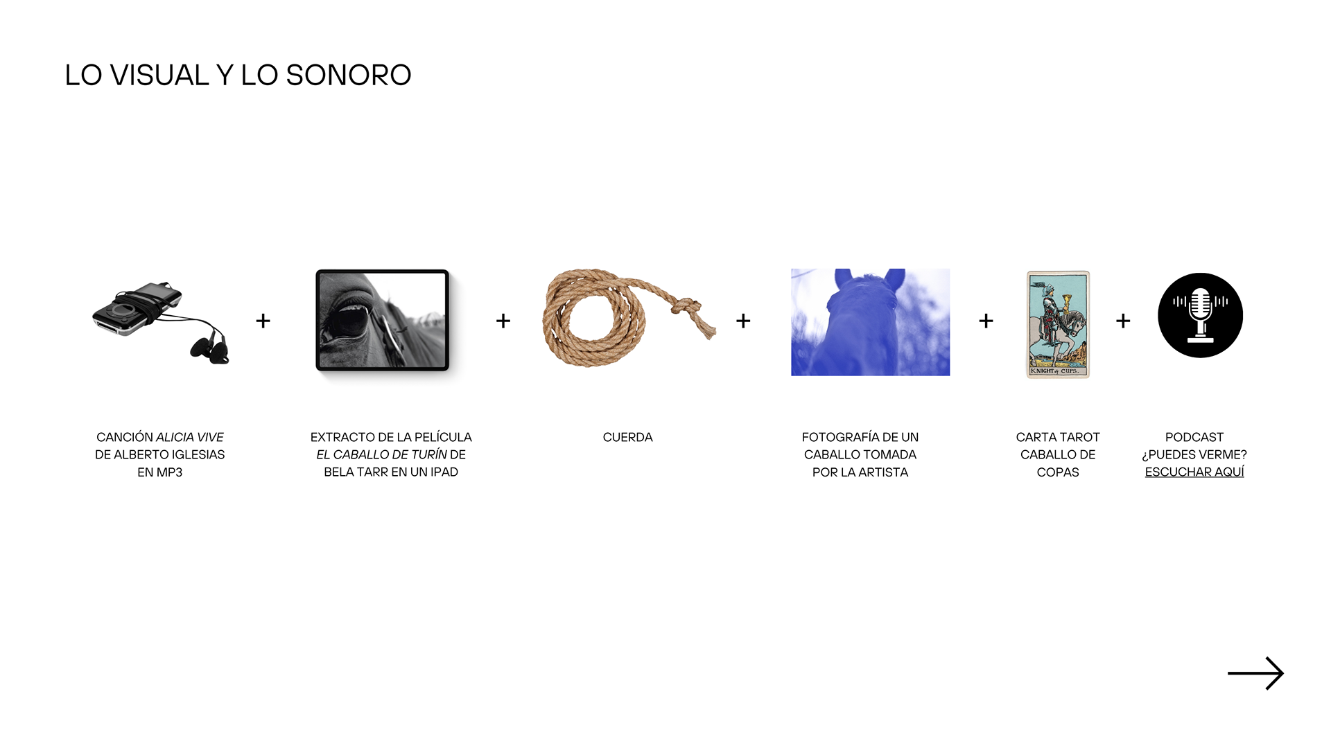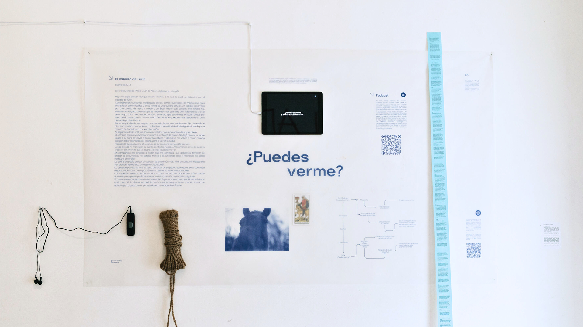 La obra se materializó en múltiples soportes —una carta, una canción, una escena de película, una cuerda, un mapa conceptual, una carta del tarot, una foto, un podcast y un diálogo con un caballo hecho con IA— que expanden la pregunta central: ¿Puedes verme?.
