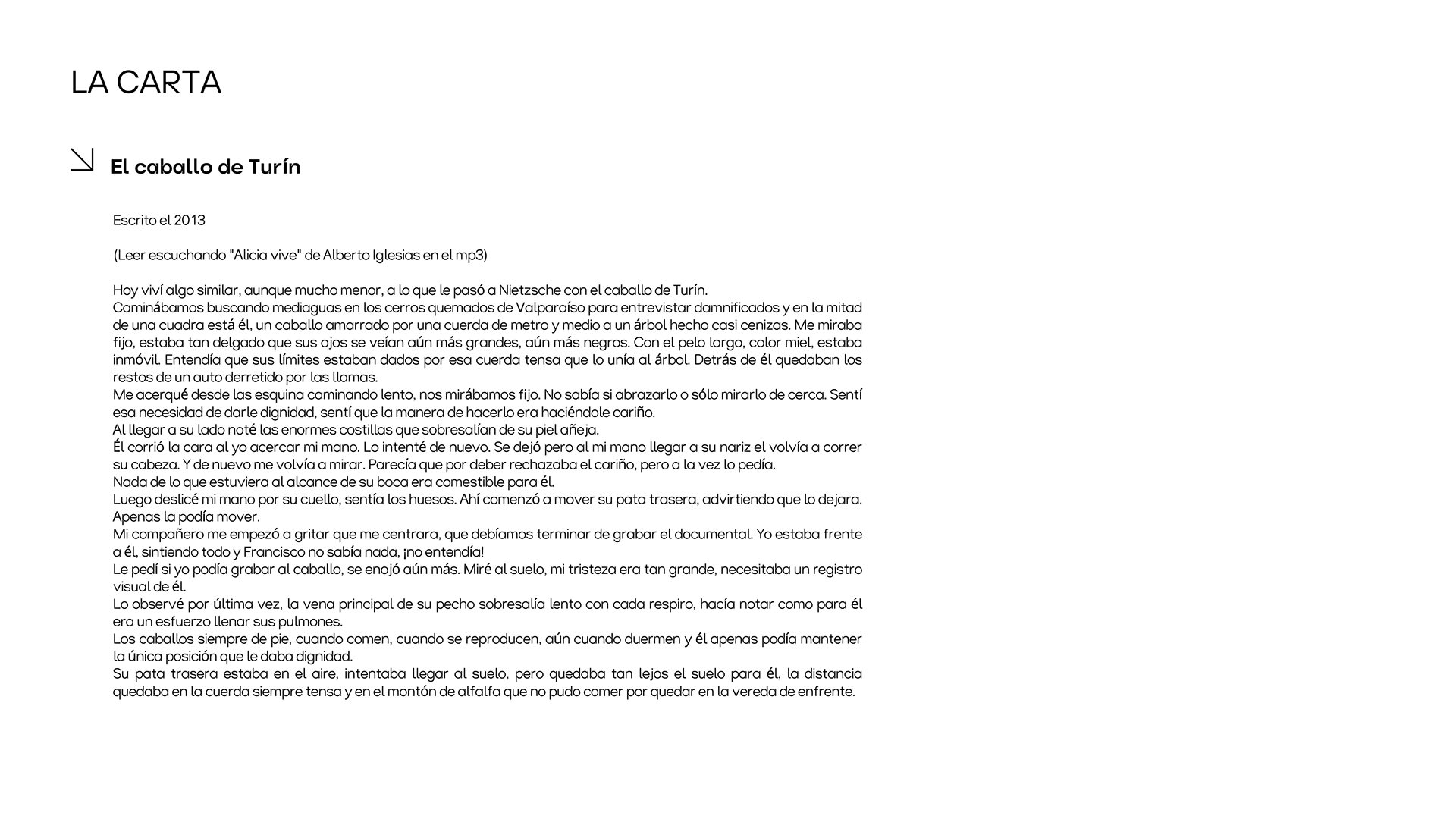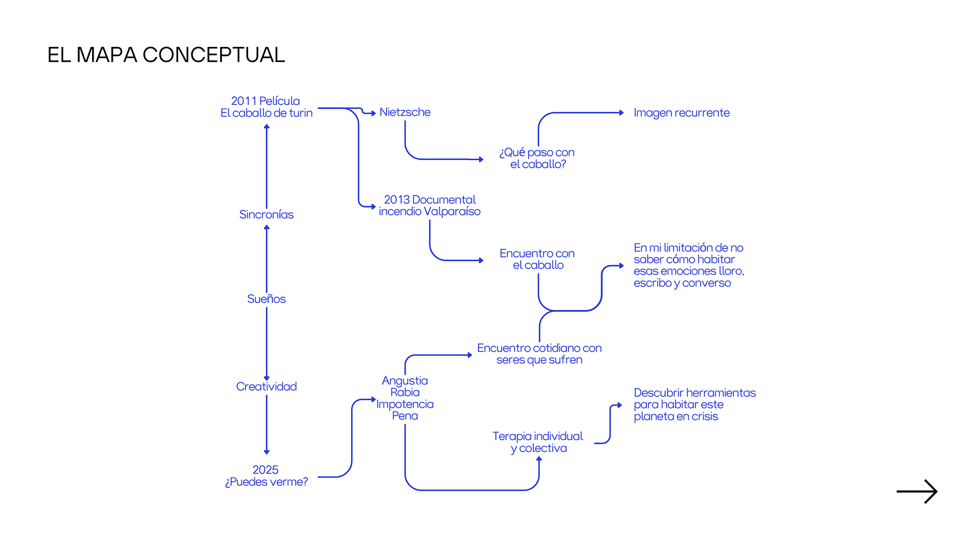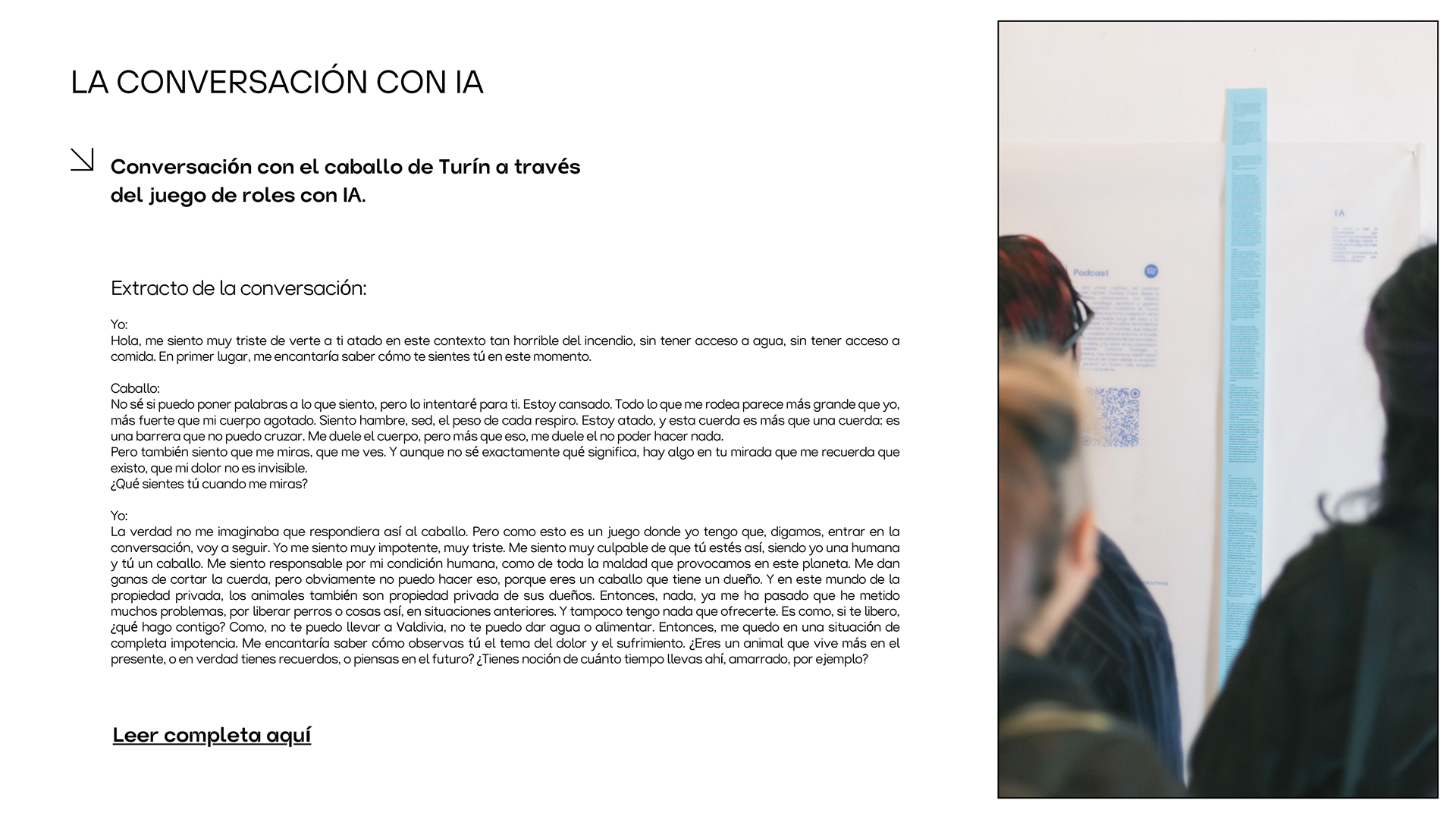 La obra se materializó en múltiples soportes —una carta, una canción, una escena de película, una cuerda, un mapa conceptual, una carta del tarot, una foto, un podcast y un diálogo con un caballo hecho con IA— que expanden la pregunta central: ¿Puedes verme?.